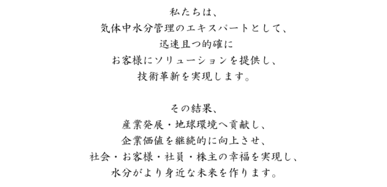 我們認為,水分管理的主題就是這樣一個古老、新、溫柔、困難的課題,TEKHNE將氣體中的水分管理視為一個業務領域, 並實施各種品質控制和濕度標準的方法, 我們相信"實現技術創新" 是製造商的自然責任,我們可以通過在露點技術的成就為社會做出貢獻。 鑒於目前技術在露點表方面沒有改變的情況, 我們相信有可能很快就會產生更新的技術, 我們希望引領這種創新,並努力從這樣的技術創新中實現國家標準和國際標準。