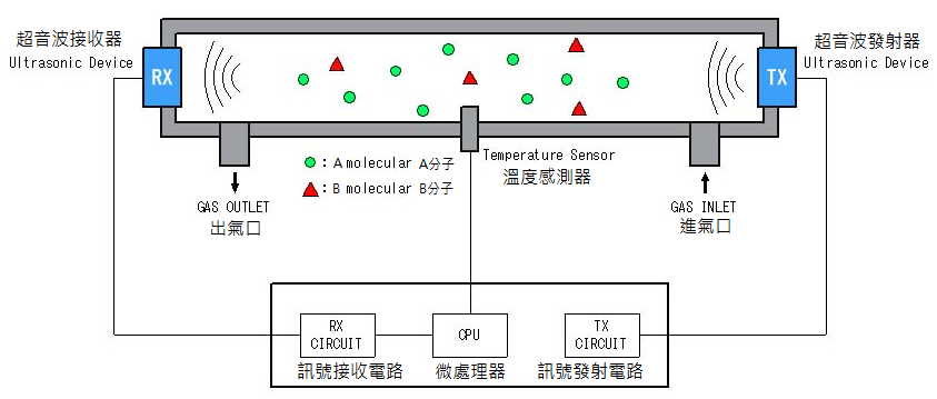 測量超聲波由發射器發出在氣體中通過並到達接收器的時間就可算出氣體聲速。