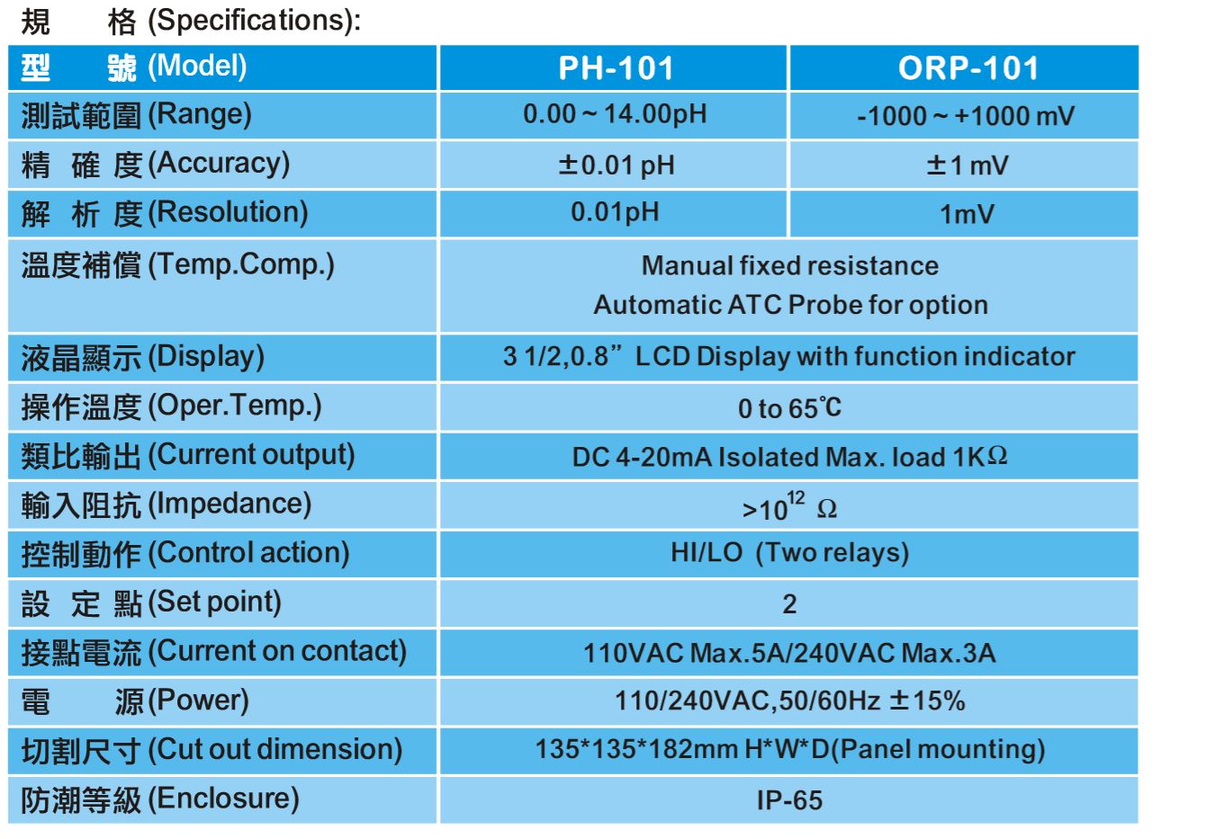 | 高輸入阻抗及抗高雜訊設計,適用於任何廠牌的 PH/ORP 電極。 |